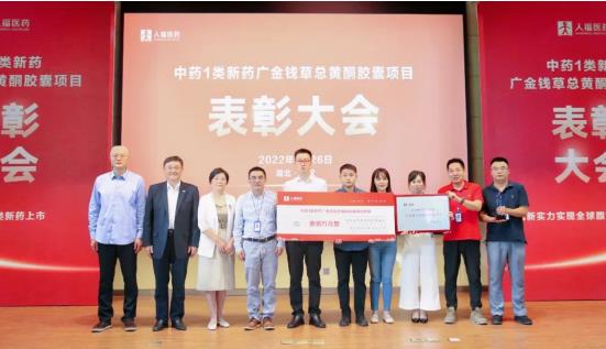 集團(tuán)副總裁于群代表總裁辦宣讀《人福醫(yī)藥集團(tuán)關(guān)于中藥創(chuàng)新藥廣金錢(qián)草總黃酮膠囊項(xiàng)目表彰的決定》:人福醫(yī)藥自主研發(fā)的1.2類(lèi)中藥創(chuàng)新藥廣金錢(qián)草總黃酮膠囊獲國(guó)家藥品監(jiān)督管理局上市批準(zhǔn),成為全球首創(chuàng)的防治尿結(jié)石癥中藥新藥,也是公司繼1類(lèi)化藥苯磺酸瑞馬唑侖、磷丙泊酚二鈉之后,獲批的第3個(gè)1類(lèi)創(chuàng)新藥。經(jīng)集團(tuán)總裁辦研究決定,授予廣金錢(qián)草總黃酮膠囊項(xiàng)目“研發(fā)創(chuàng)新獎(jiǎng)”,對(duì)項(xiàng)目團(tuán)隊(duì)通報(bào)表彰并獎(jiǎng)勵(lì)人民幣100萬(wàn)元。